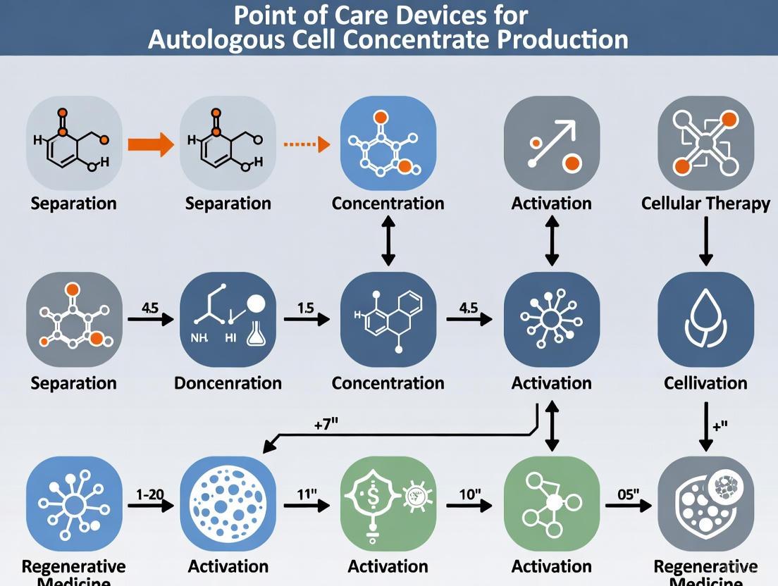 This article provides a detailed exploration of point-of-care (POC) devices for producing autologous cell concentrates, a transformative approach in decentralized therapy manufacturing. Aimed at researchers, scientists, and drug development professionals, it covers the foundational principles of POC systems, from device classification and regulatory frameworks to their mechanistic role in concentrating therapeutic cells. The scope extends to methodological applications across diverse clinical areas like orthopedics, immunology, and wound care, alongside troubleshooting strategies for process optimization and scalability. Finally, it presents a critical analysis of validation data, clinical outcomes, and comparative efficacy, synthesizing key takeaways to outline future directions for standardizing and advancing POC bioprocessing in biomedical research and clinical practice.